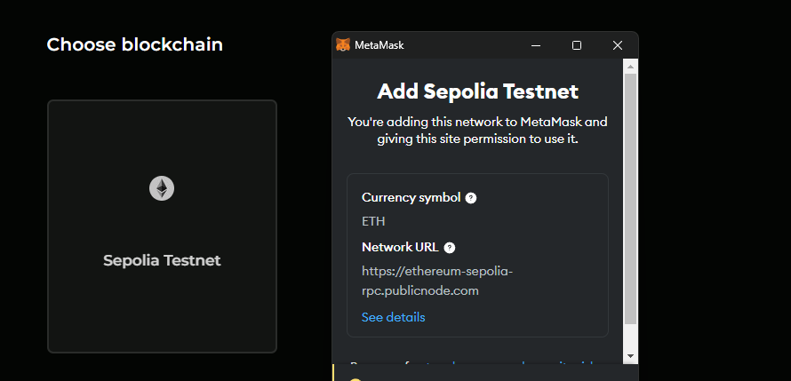If the selected blockchain is not already added to your wallet, MetaMask will prompt you to add it. Simply confirm to proceed